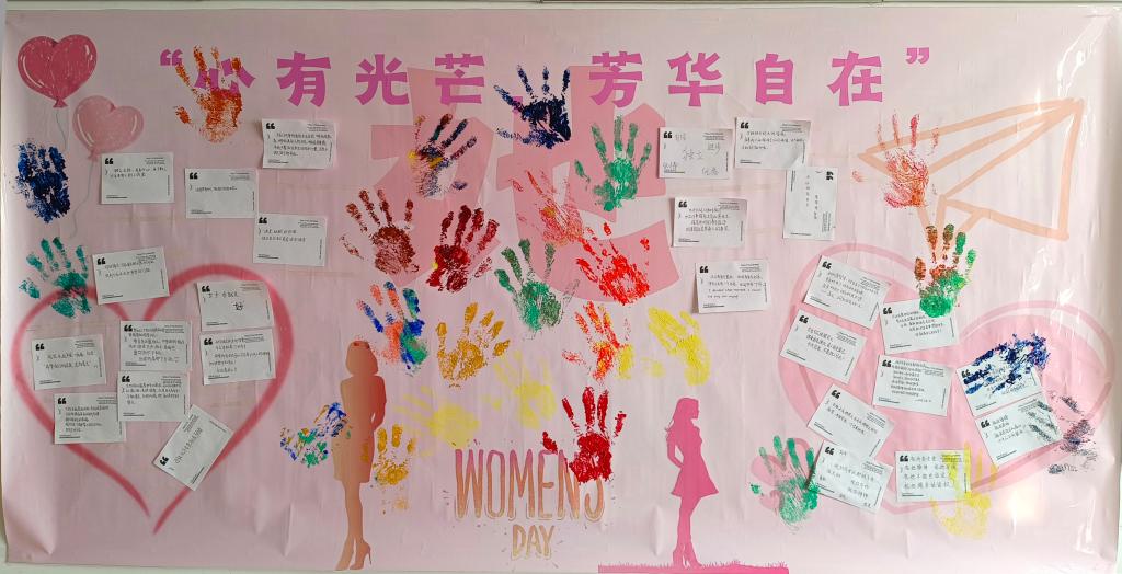 活动伊始,主讲人从妇女节起源的国际工人运动背景切入,向同学们详细科普了三八国际妇女节的历史背景,使同学们深切体会到这一节日背后的社会价值。随后,在“人生角色卡”互动中,参与者通过抽取‘母亲’‘职场人’等标签卡,用拼贴创作对比“社会定义”与“自我认知”中的女性形象,并在小组内积极分享各自的作品。结合同学们的分享与感悟,主讲人鼓励同学们要勇于打破传统性别刻板印象,努力在职业与个人成长中保持自信与勇气。紧接着,主讲人通过展示中国女科学家屠呦呦、Meta(原Facebook)首席运营官谢丽尔·桑德伯格等杰出女性案例,深入剖析了女性领导力的重要性。同学们纷纷表示,通过今天的活动,使她们感受到女性在社会发展各个领域都发挥的不可或缺的作用。活动最后,每位参与者在活动海报周围写下对自我或“她”的祝福与期望,并留下手掌印记,共同汇聚成象征女性力量的巨大“她”图案。