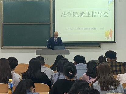 2023年4月27日下午,法学院在博文楼427教室举办了就业指导会。此次就业指导会主讲嘉宾是法学院2007届优秀校友、山东贝莱德律师事务所创始人王磊。