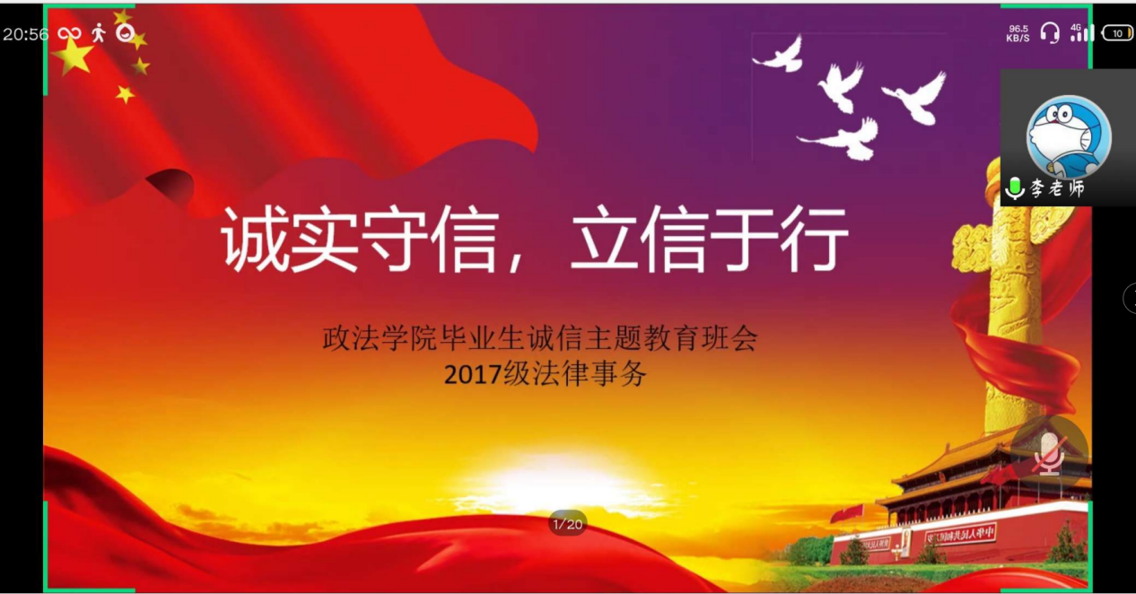 为了培养大学生的诚信意识,在学习和生活中能够自觉诚实守信、立信于行,深刻理解诚信对学生本身发展的意义。6月15日政法学院通过线上主题班会的形式举办了“诚实守信,立信于行”毕业生诚信教育主题班会活动。