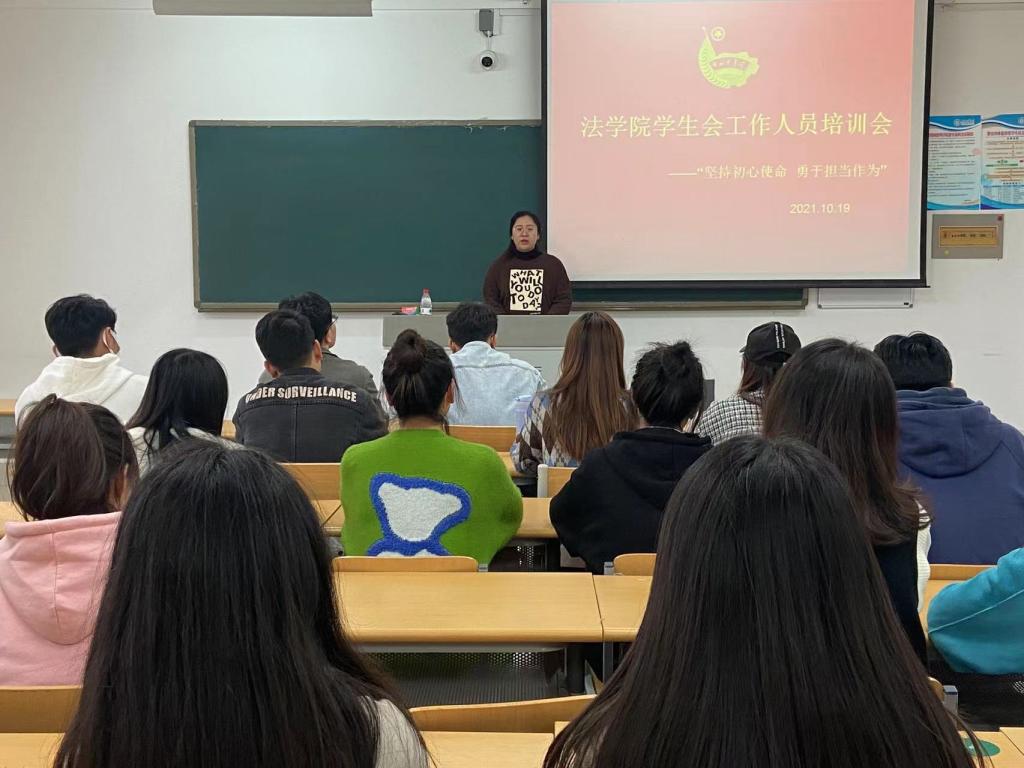 为贯彻落实关于《加强和改进新时代学联学生会工作实施方案》,加强学生会组织工作人员宗旨意识和规章制度教育,提高学生会组织工作人员政治素养和工作能力,2021年10月19日,法学院组织开展学生会工作人员培训会。法学院团总支书记与法学院学生会成员参加此次活动。