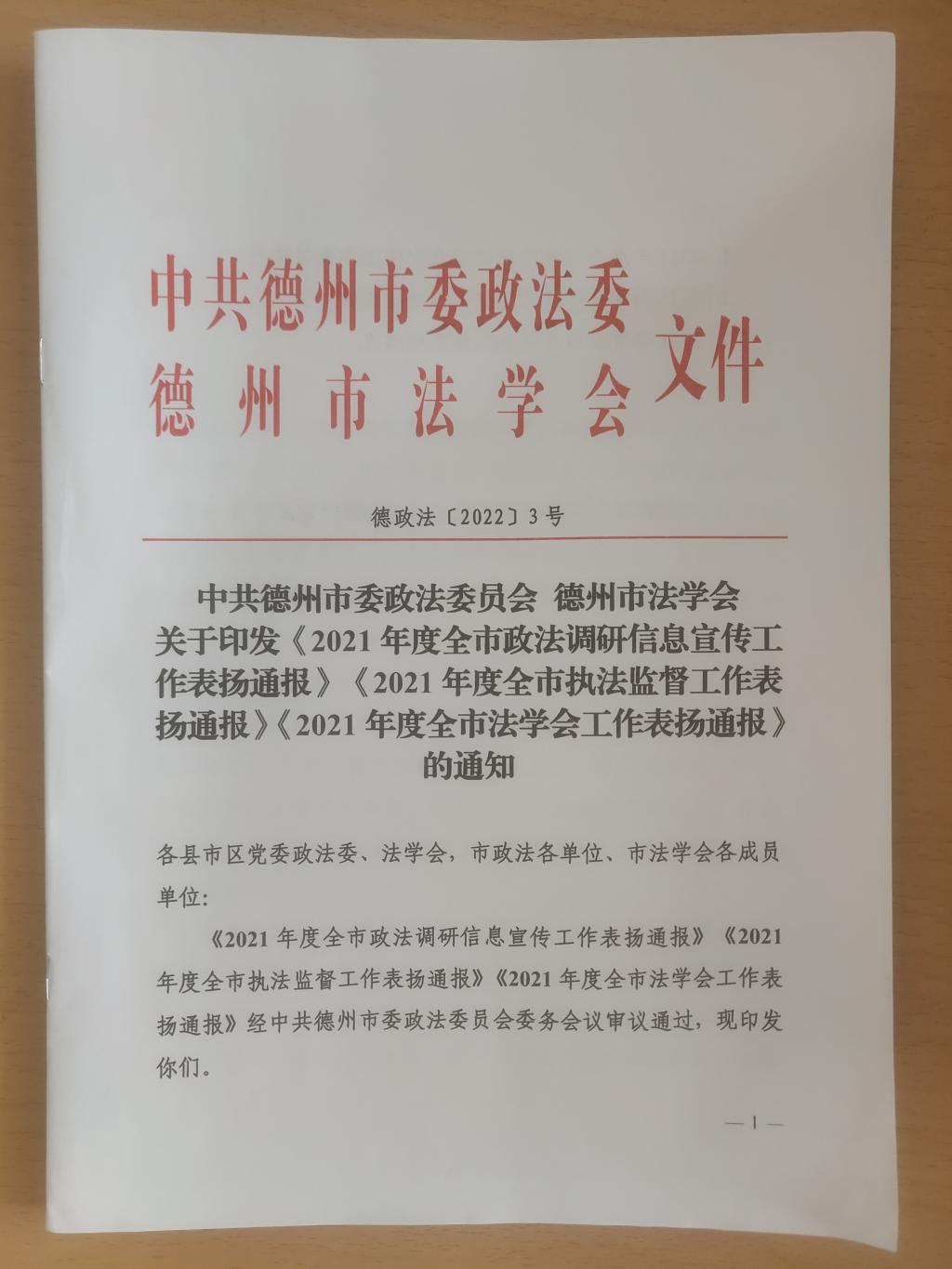 2022年3月2日,中共德州市委政法委、德州市法学会发布了《2021年度全市法学会工作表扬通报》,yl88858永利官网法学院被评为“2021年度全市法治理论研究先进单位”,徐丽红副教授被评为“2021年度市法学会会员单位先进个人”。