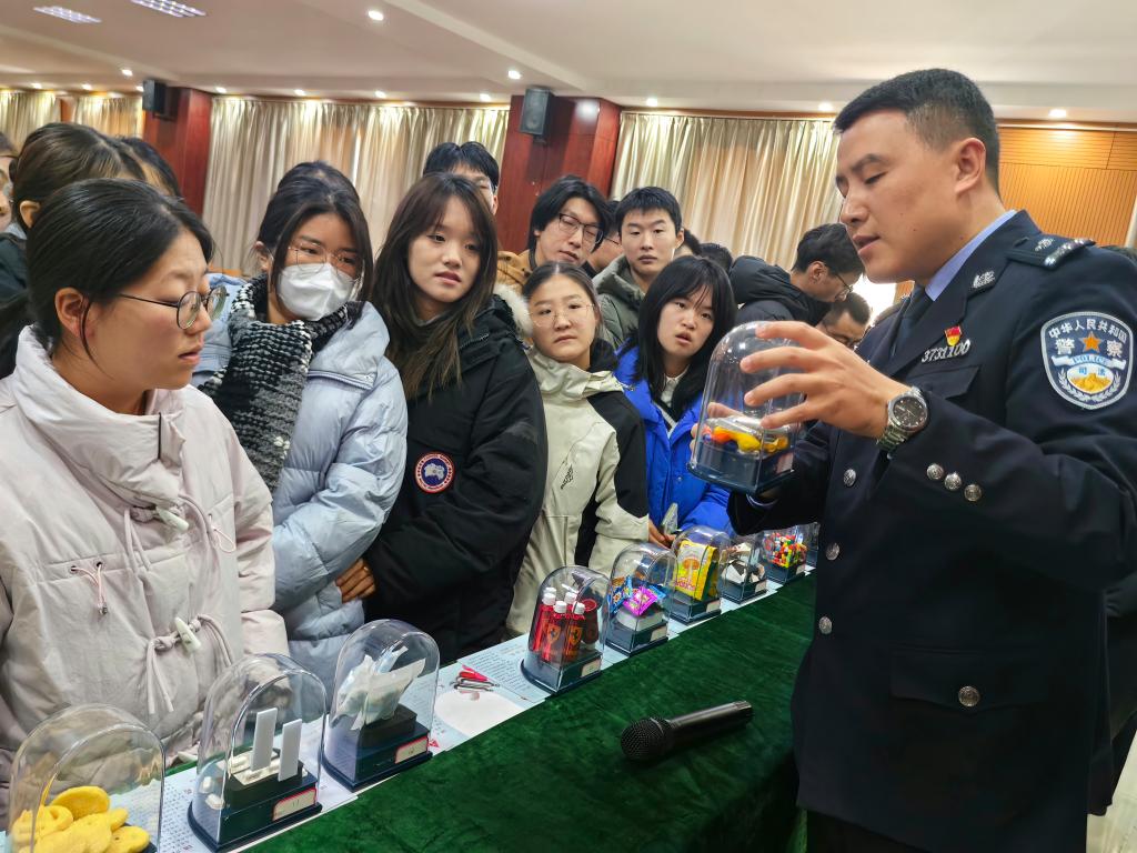在仿真毒品模型展台,刘序全一行向学生们耐心介绍毒品外观形态、吸食后症状及禁毒法律法规等,并一一解答学生疑惑。针对在校大学生社会经验不足及对当前新型毒品缺乏系统认知,特别介绍了“笑气”“毒邮票”“大麻”电子烟等迷惑性和危害性,提醒学生们在日常学习生活中要提高警惕、洁身自好,切勿因好奇而触碰吸食毒品。