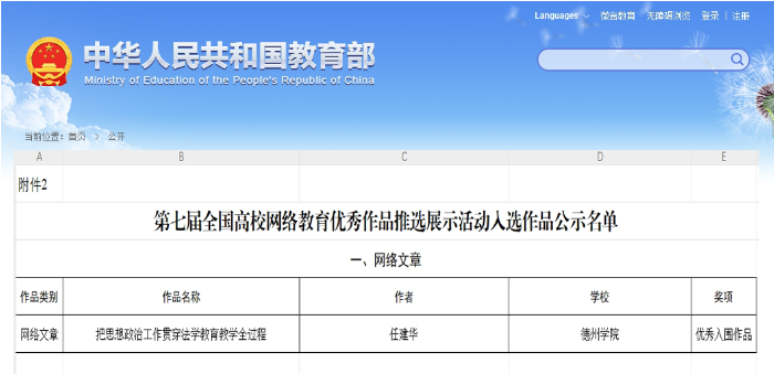 日前,由教育部思想政治工作司、中央网信办网络社会工作局联合举办的第七届“全国高校网络教育优秀作品推选展示活动”遴选结果公示,其中,永利任建华老师网络文章《把思想政治工作贯穿法学教育教学全过程》被评为优秀入围作品。