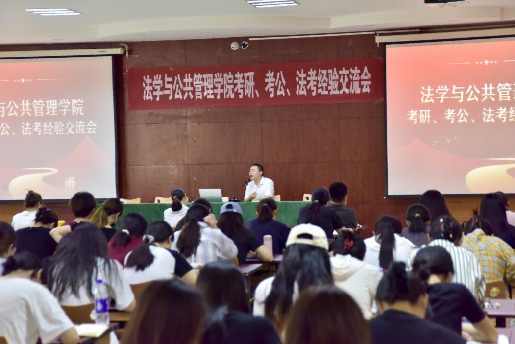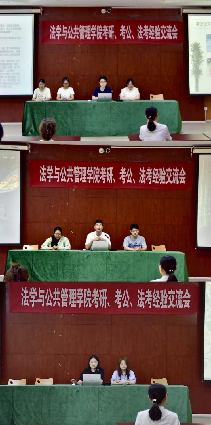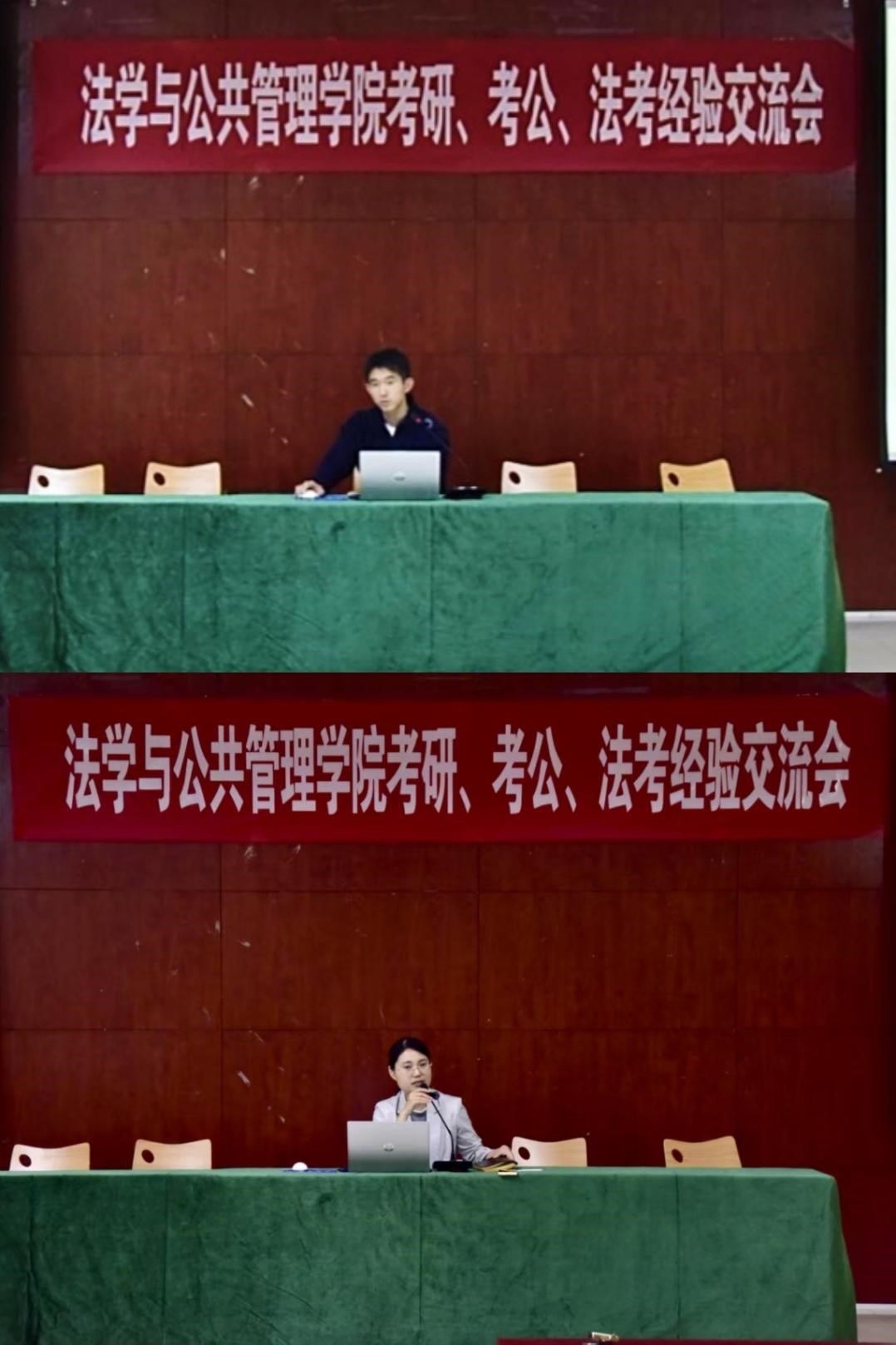 活动过程中,陈昌木等四位同学率先分享了自己的考研心得,内容涵盖了目标院校及专业选择策略、学科复习计划以及心态调整技巧,问答环节也让同学们收获颇丰。随后,金扬波等人详细分享了考公经历,介绍了公务员考试流程、行政能力测试和申论备考技巧,并传授了高效的答题策略与时间管理方法。在法考经验交流环节,郭乐和孙苗苗两位同学依托自身专业知识和备考经验,讲解了法考重点科目、备考关键要点及合理复习时间规划,帮助同学们全面了解了法考备考要点。法学系主任石春东、青年教师崔建从专业教师的角度分享了诸多实用的备考建议,并传达了学院对学生的期望。