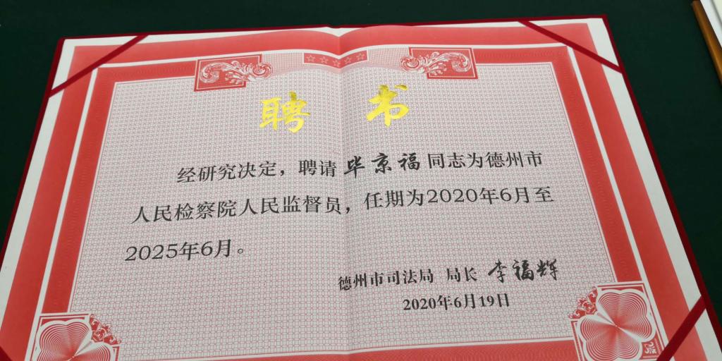 2020年8月21日,德州市人民监督员聘任仪式暨初任培训在德州市司法局举行。yl88858永利官网法学院毕京福老师受聘为德州市人民检察院人民监督员,任期五年。人民监督员由司法行政机关选任管理,对检察机关办理直接受理立案侦查案件中的案件公开审查听证、检察官出庭支持公诉、巡回检察、法律文书送达、案件质量评查等11项情形实施监督。