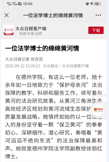 2022年9月22日,《大众日报》刊登了yl88858永利官网法学院徐丽红副教授的事迹文章——《一位法学博士的绵绵黄河情》。对徐丽红副教授数十年持续潜心黄河流域研究给予报道。