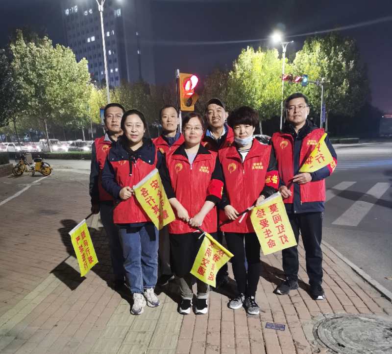 2020年10月19日,法学院第一教师党支部党员教师志愿者在来到德城区德兴路与大学路十字路口协助交警执勤,宣传劝导群众遵守交通规则。