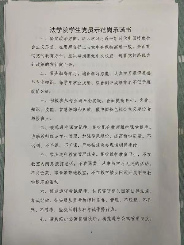 本次学习活动由李梦妍老师主持,首先介绍了本次学习活动的主题,明确了本次学习活动的内容。接着,李梦妍老师领学《法学院学生党员示范岗承诺书》相关要点。李老师强调学生党员要统一思想,坚定信心,牢记青年的使命与担当,在学习、工作、生活中做出表率,充分发挥模范带头作用。永利学生党员在认真聆听讲解后,纷纷表示对此次学习活动有了更加清醒、全面的认识,并在承诺书背后签下了自己的名字,表示自己会严守党员标准,坚持以知促行、知行合一,不断改进工作作风和提高服务质量,在推进法治社会发展稳定中当标兵、做模范,用实际行动彰显共产党人的风采。